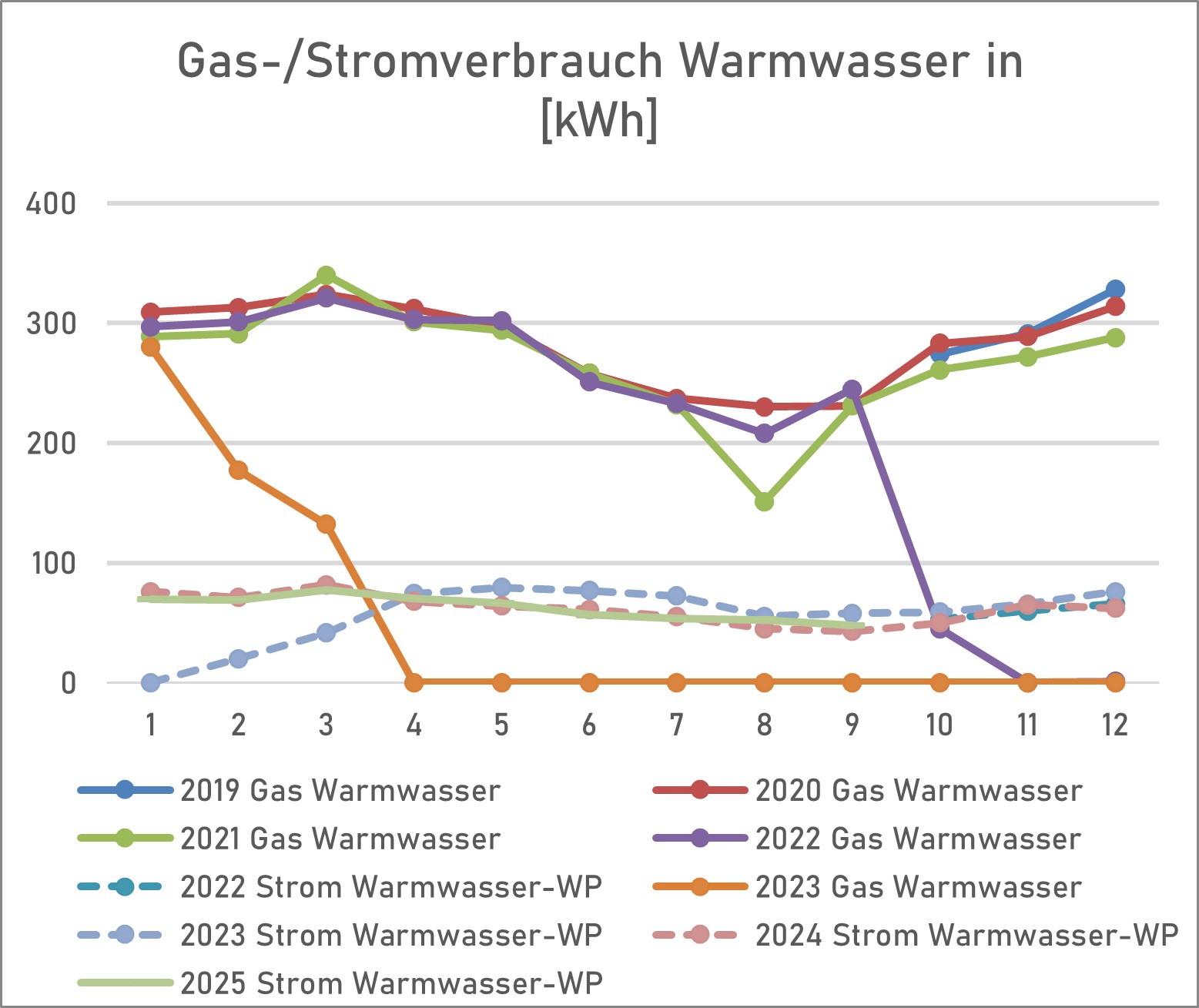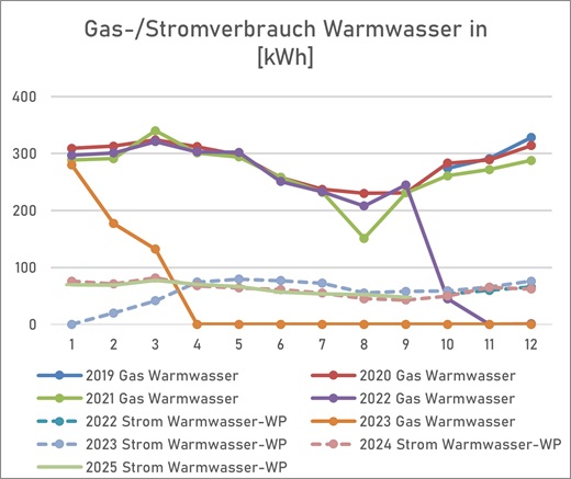 Im Diagramm sind die Gasverbräuche der letzten Jahre und der Stromverbrauch der Brauchwasserwärmepumpe dargestellt. Von Januar bis März 2023 haben wir wieder mit Gas Warmwasser erzeugt soweit die Photovoltaik nicht genug Strom geliefert hat, da in diesem Zeitraum das Verhältnis von Gas- zu Strompreis deutlich schlechter als 4,5 war (Gas 8,5ct/kWh, Strom 48ct/kWh). Ab dem Jahr 2024 gibt es keine Linie zum Gasverbrauch, da die Brauchwasserwärmepumpe die Versorgung allein bestreitet. Ab Sommer 2024 ist der Stromverbrauch etwas geringer als 2023, da die oben beschriebene Temperaturanhebung über den SG Ready-Kontakt nicht mehr aktiv ist.