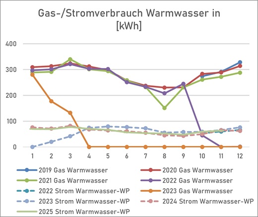 Im Diagramm sind die Gasverbräuche der letzten Jahre und der Stromverbrauch der Brauchwasserwärmepumpe dargestellt. Von Januar bis März 2023 haben wir wieder mit Gas Warmwasser erzeugt soweit die Photovoltaik nicht genug Strom geliefert hat, da in diesem Zeitraum das Verhältnis von Gas- zu Strompreis deutlich schlechter als 4,5 war (Gas 8,5ct/kWh, Strom 48ct/kWh). Ab dem Jahr 2024 gibt es keine Linie zum Gasverbrauch, da die Brauchwasserwärmepumpe die Versorgung allein bestreitet. Ab Sommer 2024 ist der Stromverbrauch etwas geringer als 2023, da die oben beschriebene Temperaturanhebung über den SG Ready-Kontakt nicht mehr aktiv ist.