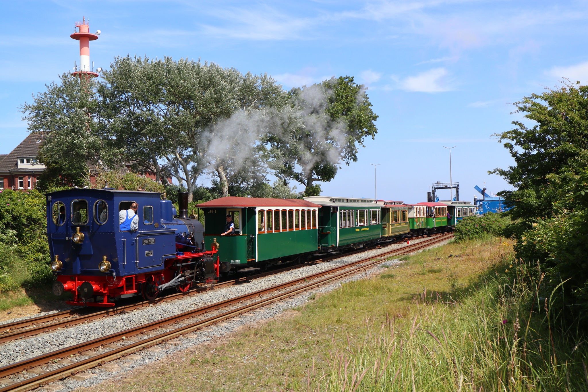 Der Nostalgiezug am 4.7.2018 mit Dampflok Borkum im Blick vom neuen Leuchtturm