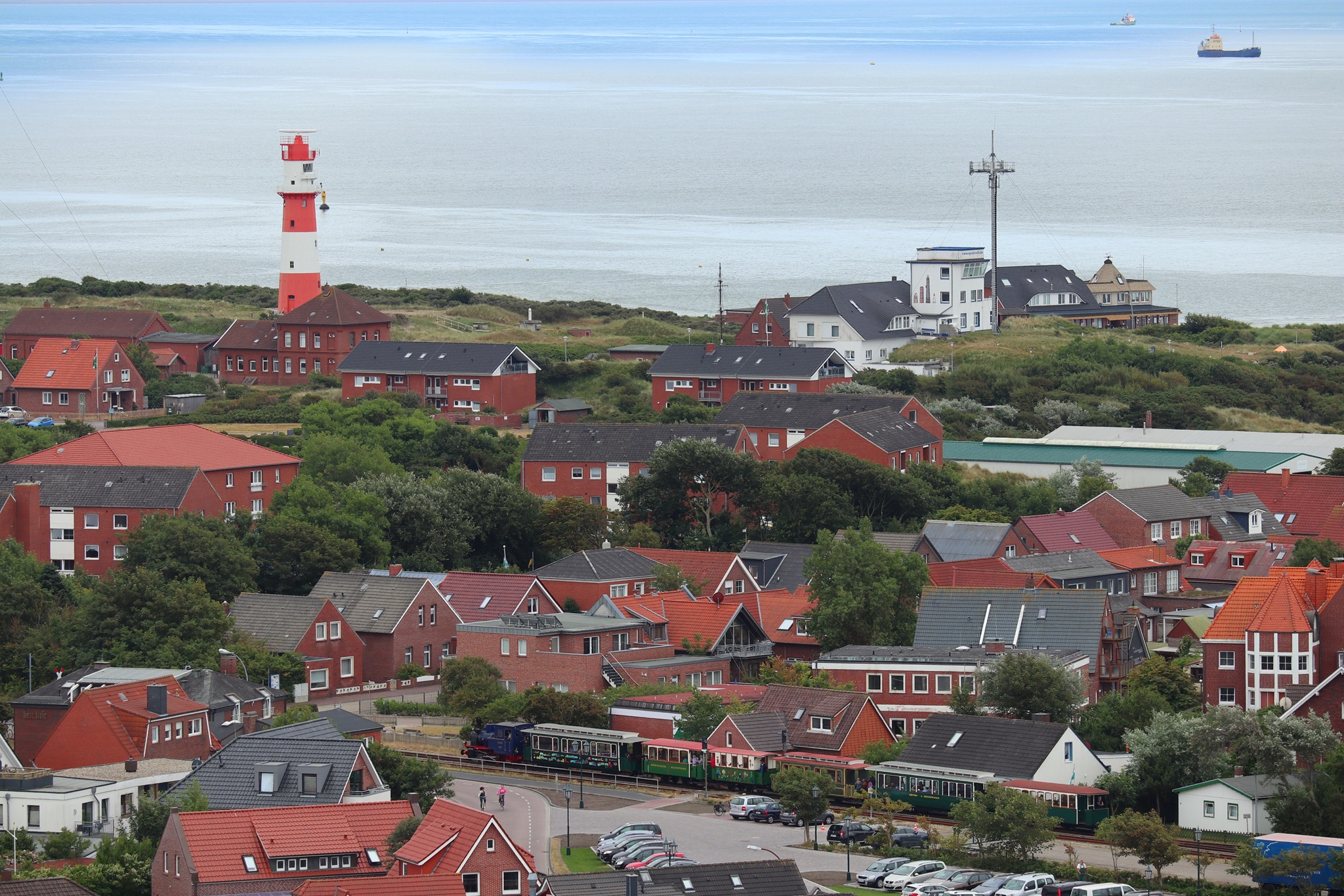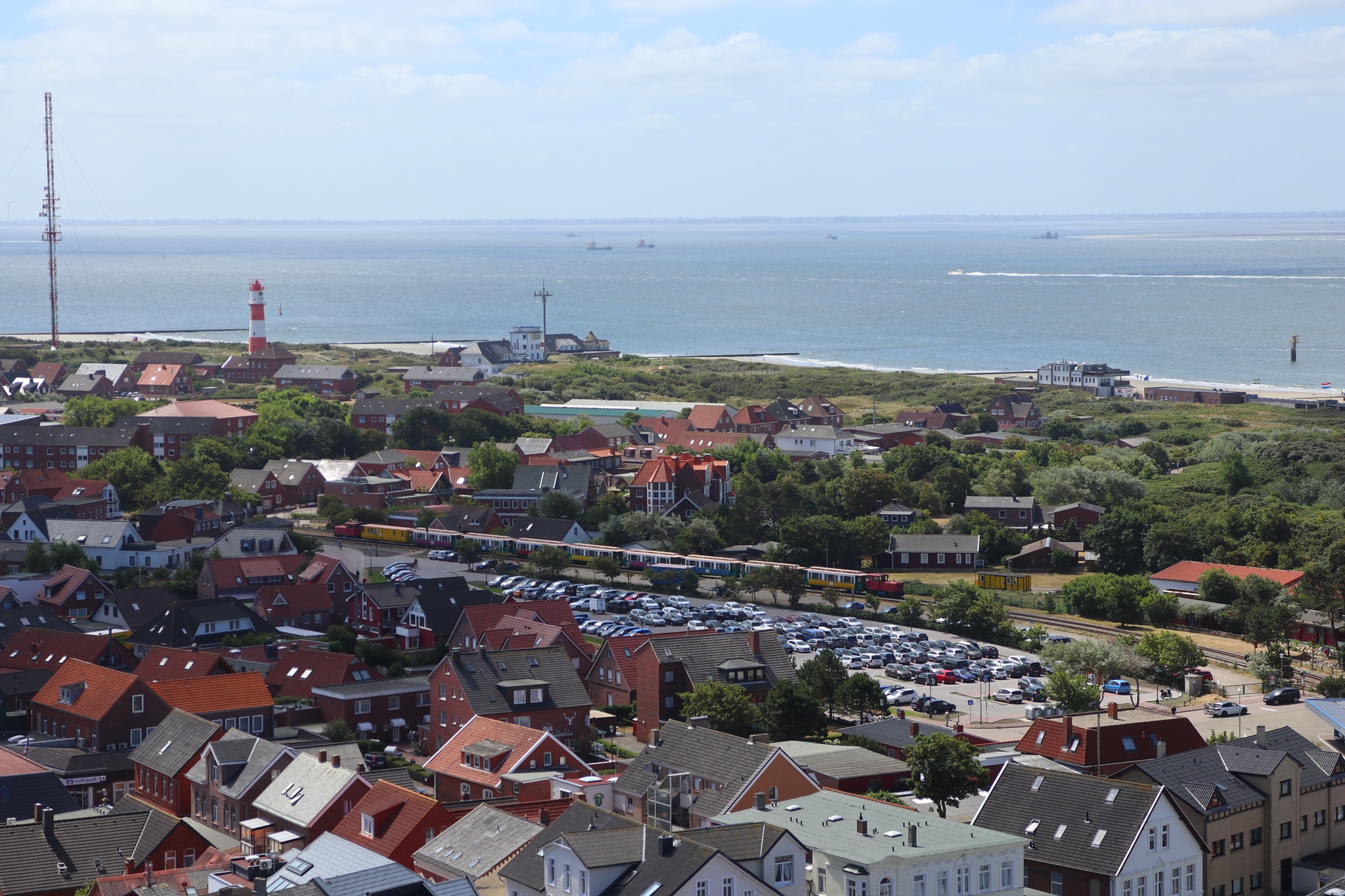 Ein Zug der Inselbahn am 6.7.2018 im Blick vom neuen Leuchtturm